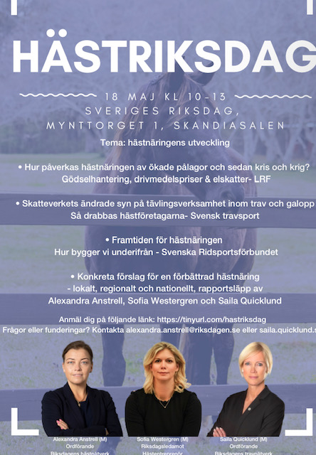 Under temat ”hästnäringens utveckling” arrangeras denna halvdagskonferens i Sveriges Riksdag. Bland arragörerna finns Svensk Travsports styrelseledamot Saila Quicklund.