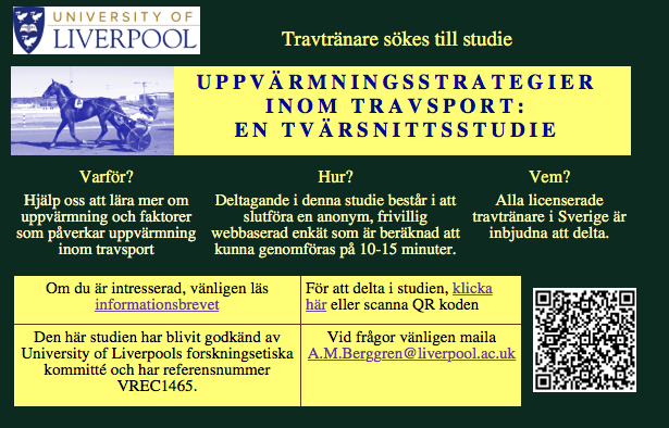 Marielle Berggren studerar till en Masterexamen vid University of Liverpool. Studien har titeln; Uppvärmningsstrategier inom travsport: en tvärsnittsstudie. Hon behöver nu hjälp med att få information från TR:s medlemmar avseende värmningsrutiner.